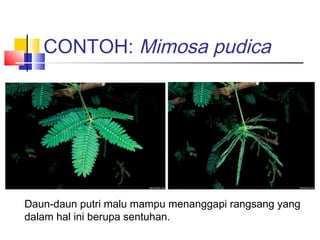 Tumbuhan dapat memberi respon terhadap lingkungan melalui berbagai jenis gerak, seperti tropisme, taksis, dan nasti. Gerak tropisme ditentukan oleh arah stimulus dan diatur oleh hormon seperti auksin. Gerak tumbuhan memungkinkan adaptasi terhadap faktor lingkungan seperti cahaya, air, dan gravitasi.