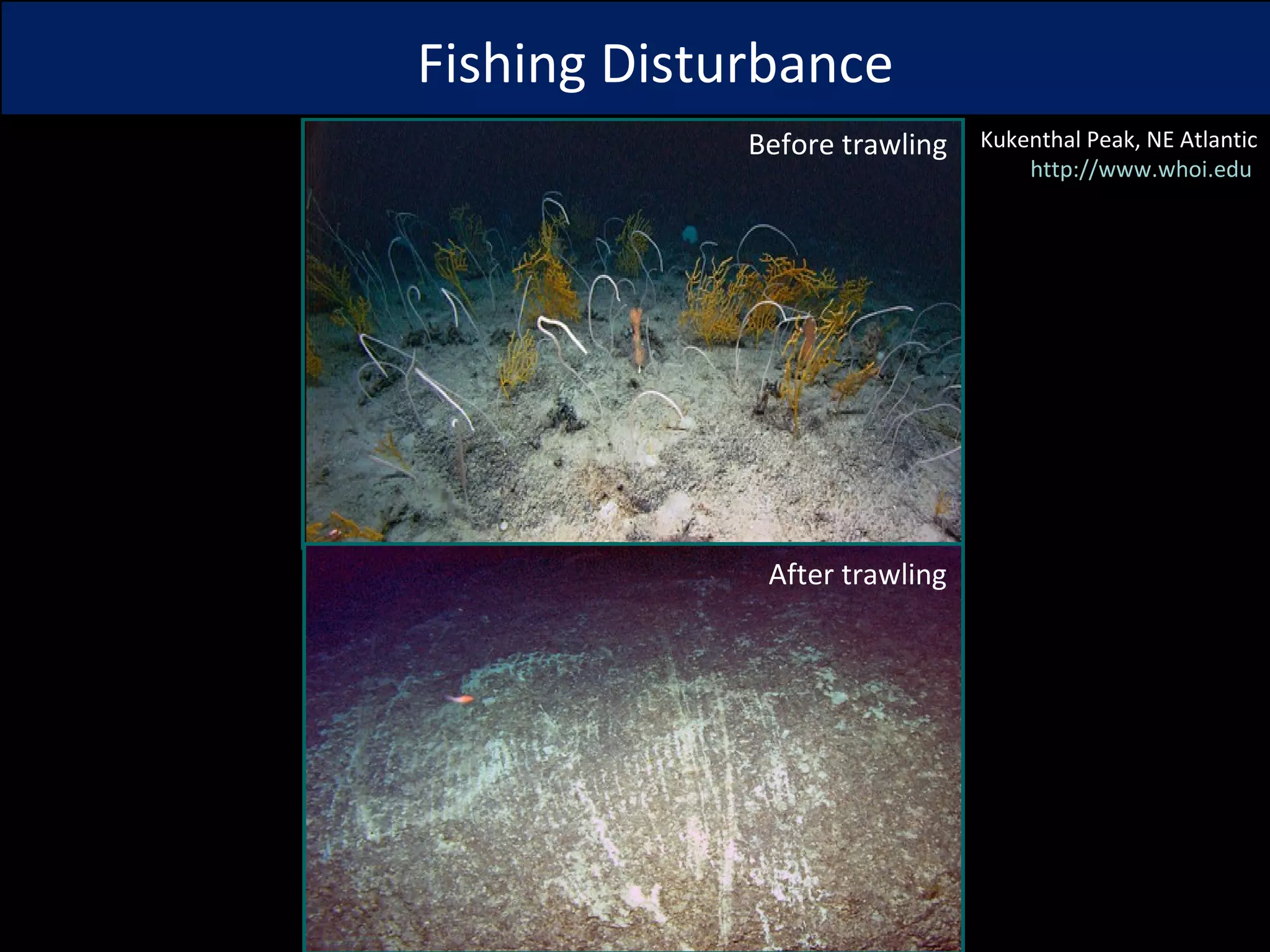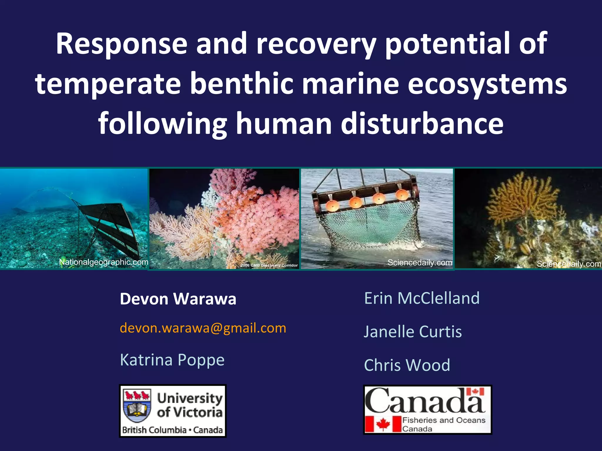 This document summarizes a meta-analysis examining the response and recovery of benthic marine ecosystems following disturbance from fishing activities. The analysis found that gear type is an important predictor of impacts to species richness and abundance, with beam trawls and dredges tending to have stronger negative effects. Substrate type also influenced recovery, with slower recovery in sandy habitats. Duration of disturbance and depth were less reliable predictors. The analysis was limited by a lack of long-term data needed to fully assess recovery timelines. Improved monitoring is needed to identify vulnerable areas and inform management.