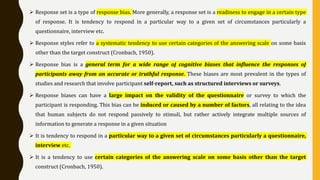 The document discusses response bias in psychological research, specifically focusing on concepts like response sets, social desirability bias, and acquiescence. It highlights the various factors that can influence participant responses, leading to inaccuracies in self-reported data. Additionally, it suggests methods to mitigate these biases to improve the validity of research findings.