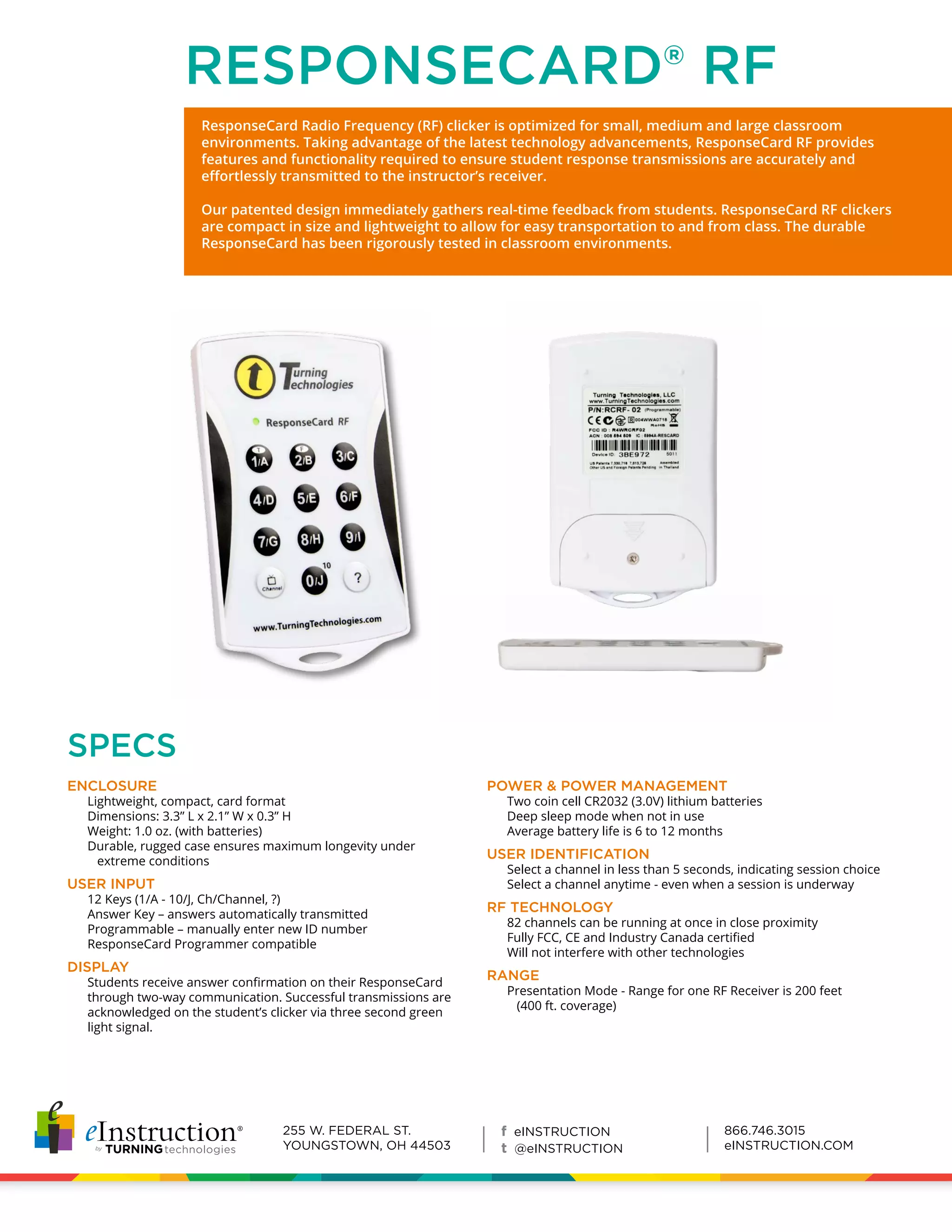 The responsecard RF clicker is designed for various classroom sizes, utilizing advanced technology for accurate student feedback transmission to instructors. It features a compact and durable design, with a battery life of 6 to 12 months and supports 82 channels for simultaneous use. The clicker provides real-time answer confirmations and is compatible with responsecard programming tools.
