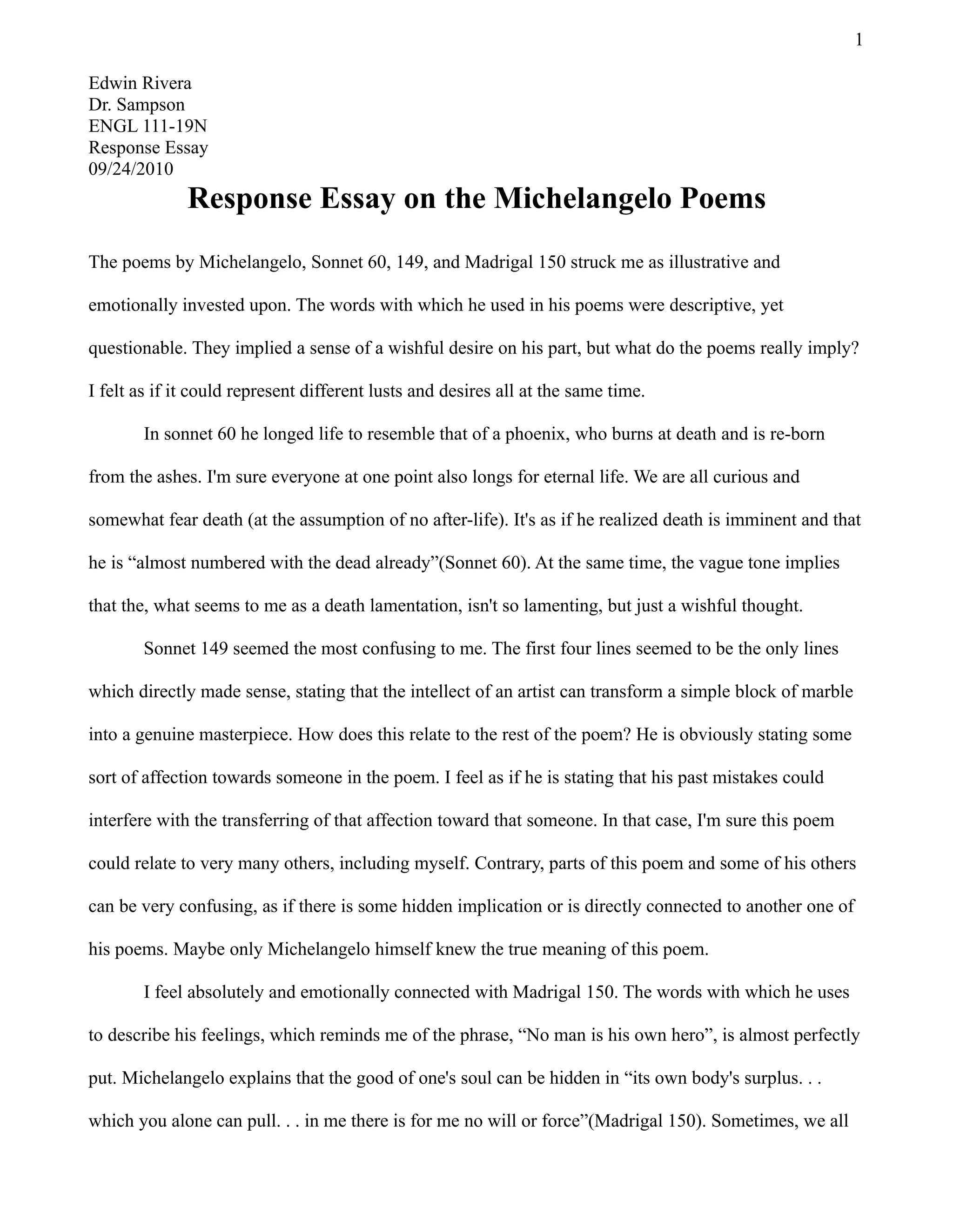 1. The student responds to three poems by Michelangelo - Sonnet 60, Sonnet 149, and Madrigal 150.