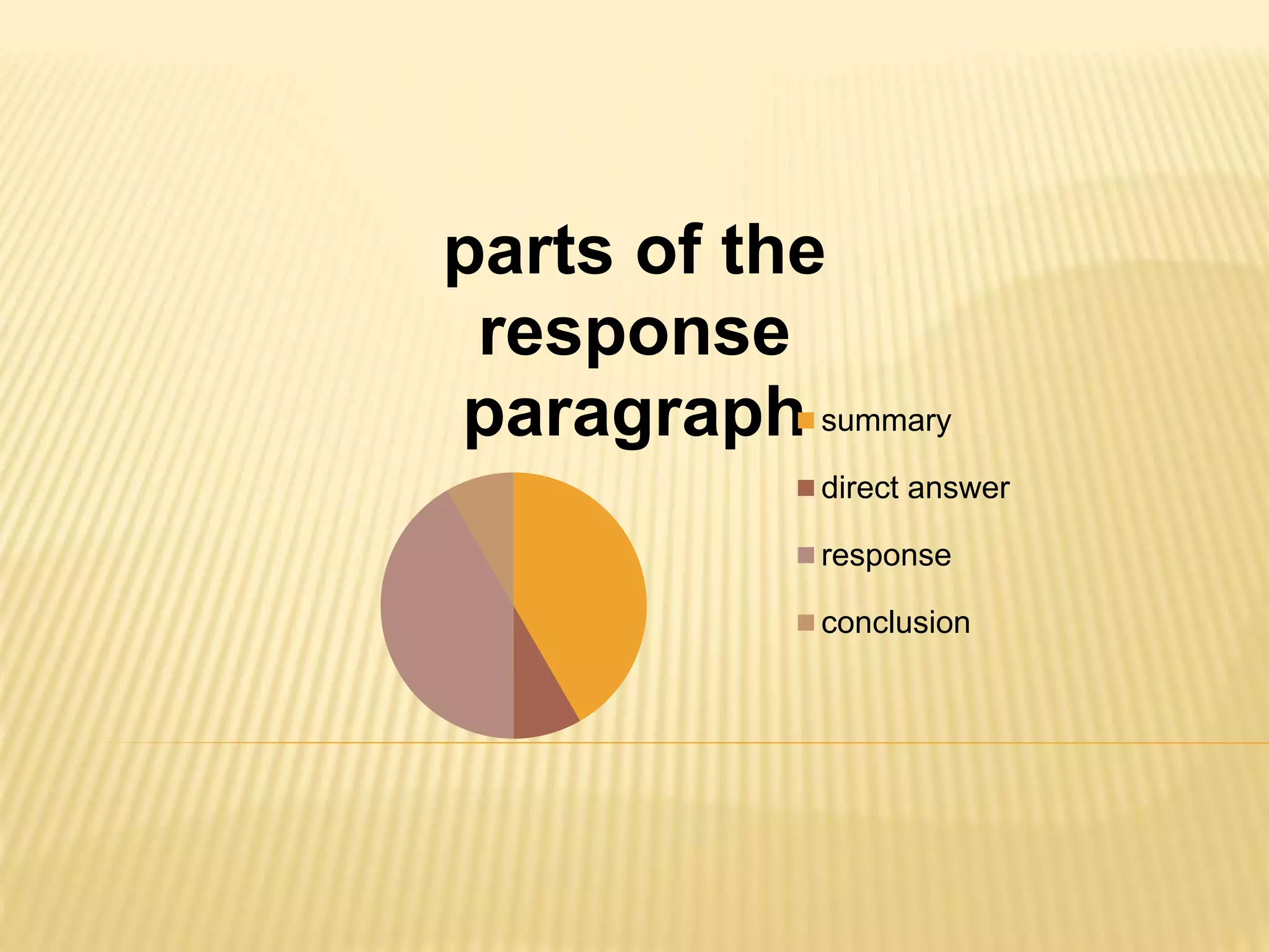 The document discusses the response paragraph, which is a short reflective piece of writing that interprets and analyzes a text. A response paragraph typically includes a summary of the main ideas from the text, a direct answer to any question posed, evidence from the text to support the writer's opinion, and a concluding remark. The document provides the structure of a response paragraph, including summarizing the main idea, directly answering any question, citing supporting details from the text, including optional supporting details from the writer's own experience, and concluding. An example response paragraph is also included to demonstrate these components.