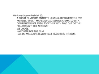 The document discusses a music documentary project that will profile an unknown band. It will include filmed performances and footage of the band during their daily activities and interactions with fans to give viewers a new perspective. Inspiration comes from documentaries that provide a real look at artists' mundane routines. The project will include a film poster to advertise the documentary along with the film itself.