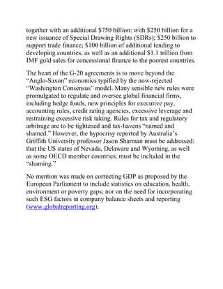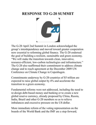 The G-20 summit in April 2009 focused on enhancing global cooperation to reform financial systems and transition to a sustainable, green economy, with a $5 trillion commitment by member countries expected to boost global output by 4%. While agreements were reached on regulating financial firms and addressing climate change, fundamental reforms related to currency and representation in institutions like the World Bank and IMF were largely sidelined. Concerns about hypocrisy regarding tax havens and the need for more inclusive economic indicators were also highlighted.