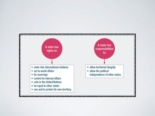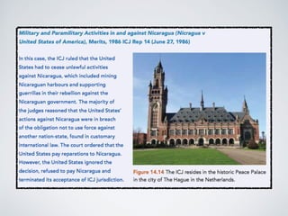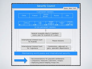 The document discusses various legal and non-legal responses to promoting world order. It covers the role of the UN and international law, describing treaties, the UNSC, and courts like the ICJ. It also discusses regional organizations like the EU and NATO, as well as the roles of NGOs, media, and powers like negotiation, persuasion, and force. The overall theme is the effectiveness of these approaches in maintaining international peace and security.