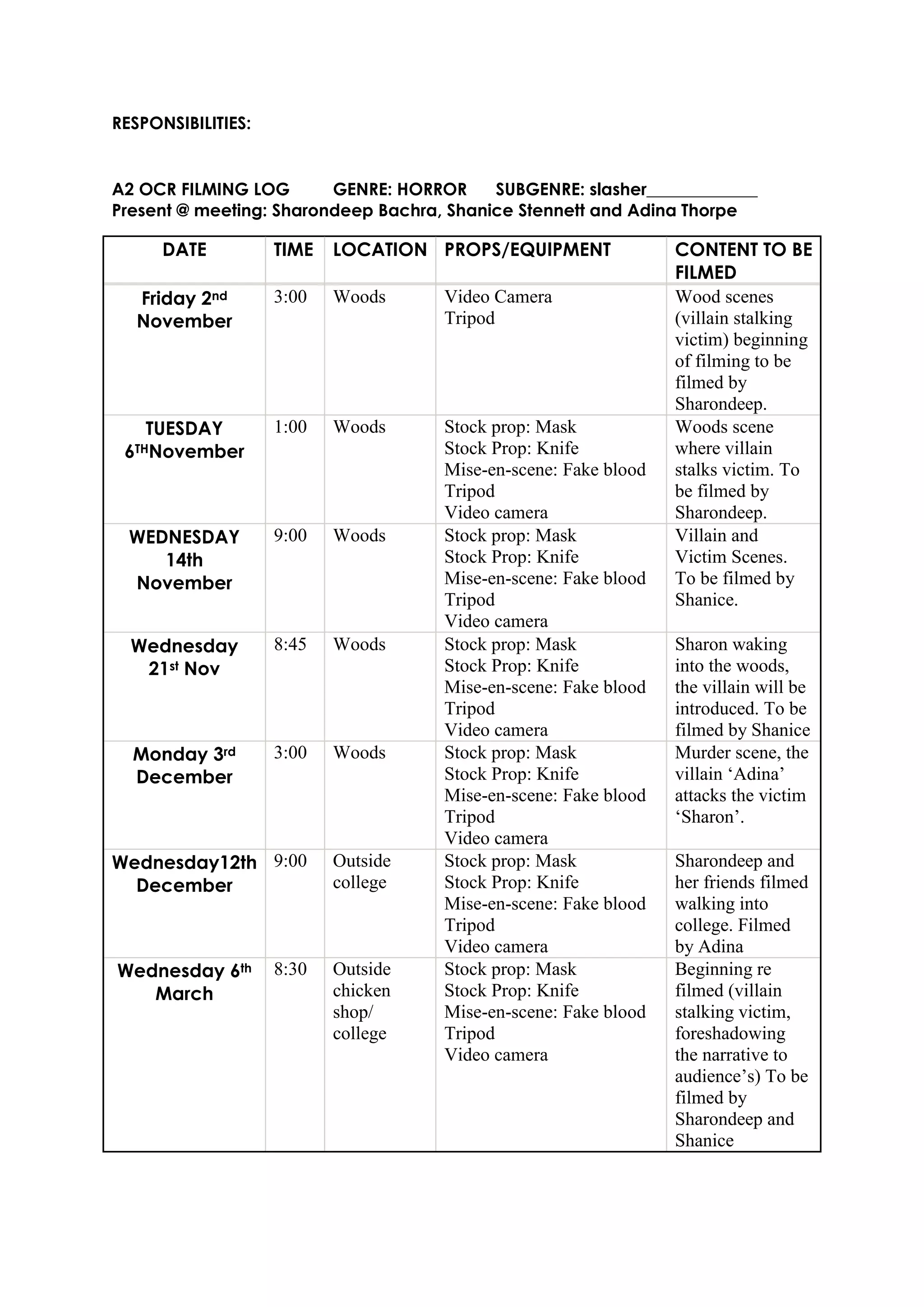 This filming log outlines the schedule, locations, props, and content to be filmed for an horror/slasher genre film. It assigns filming responsibilities to Sharondeep Bachra, Shanice Stennett and Adina Thorpe on various dates in November, December, and March. The log details scenes filmed in the woods involving a villain stalking and attacking a victim, as well as scenes outside of college. Props include a mask, knife, and fake blood.