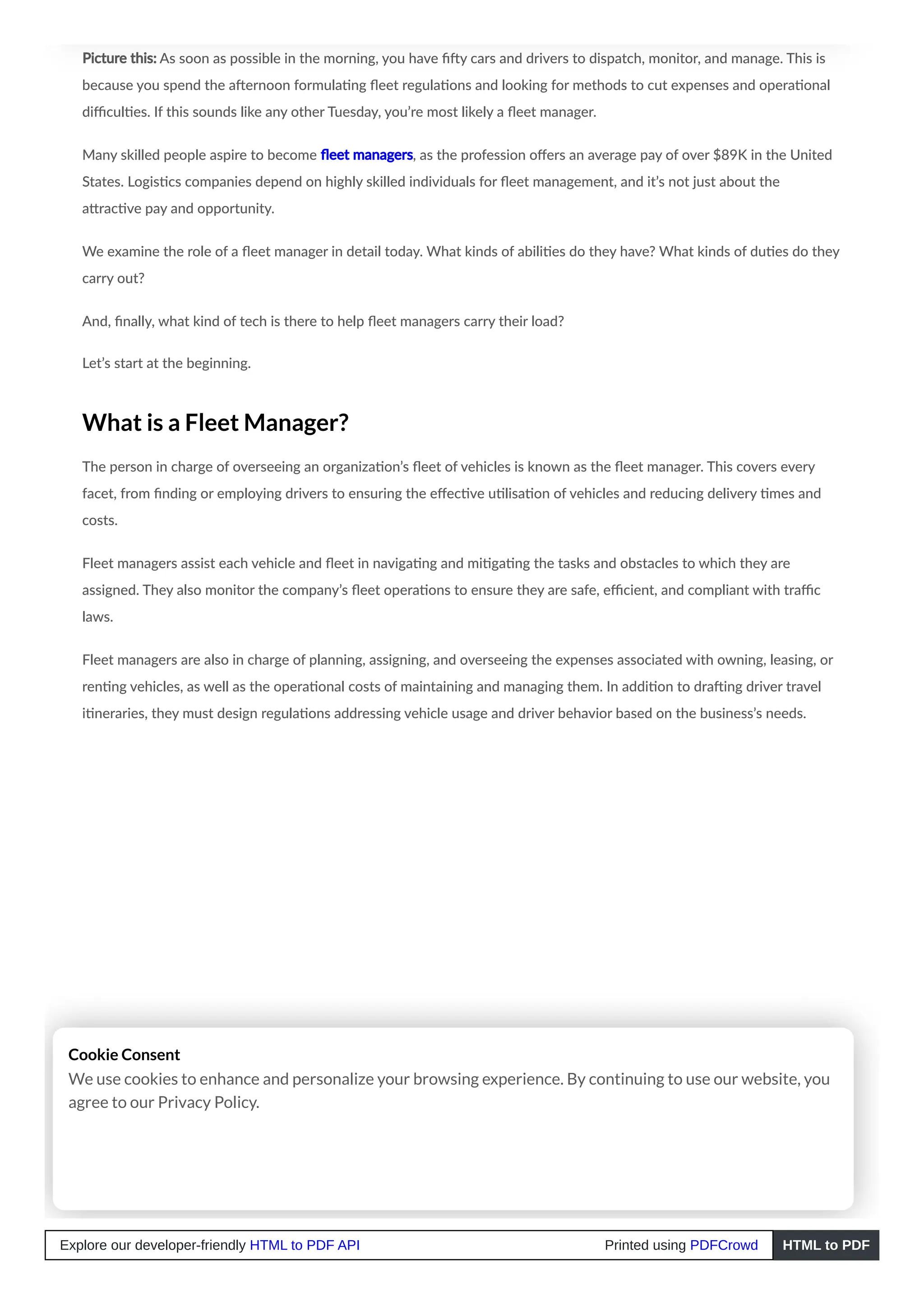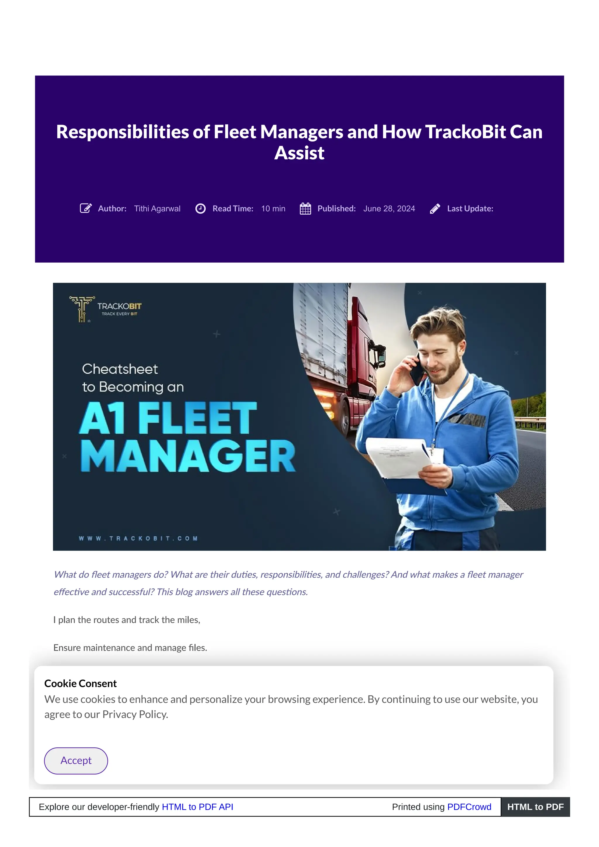 The document discusses the critical responsibilities of fleet managers, including vehicle procurement, compliance, driver management, and improving operational efficiency, supported by technology like fleet management software. It highlights the importance of effective communication, safety prioritization, and the adoption of telematics to enhance fleet performance. Additionally, it introduces Trackobit as a tool that aids fleet managers in their duties, from route planning to maintenance management.