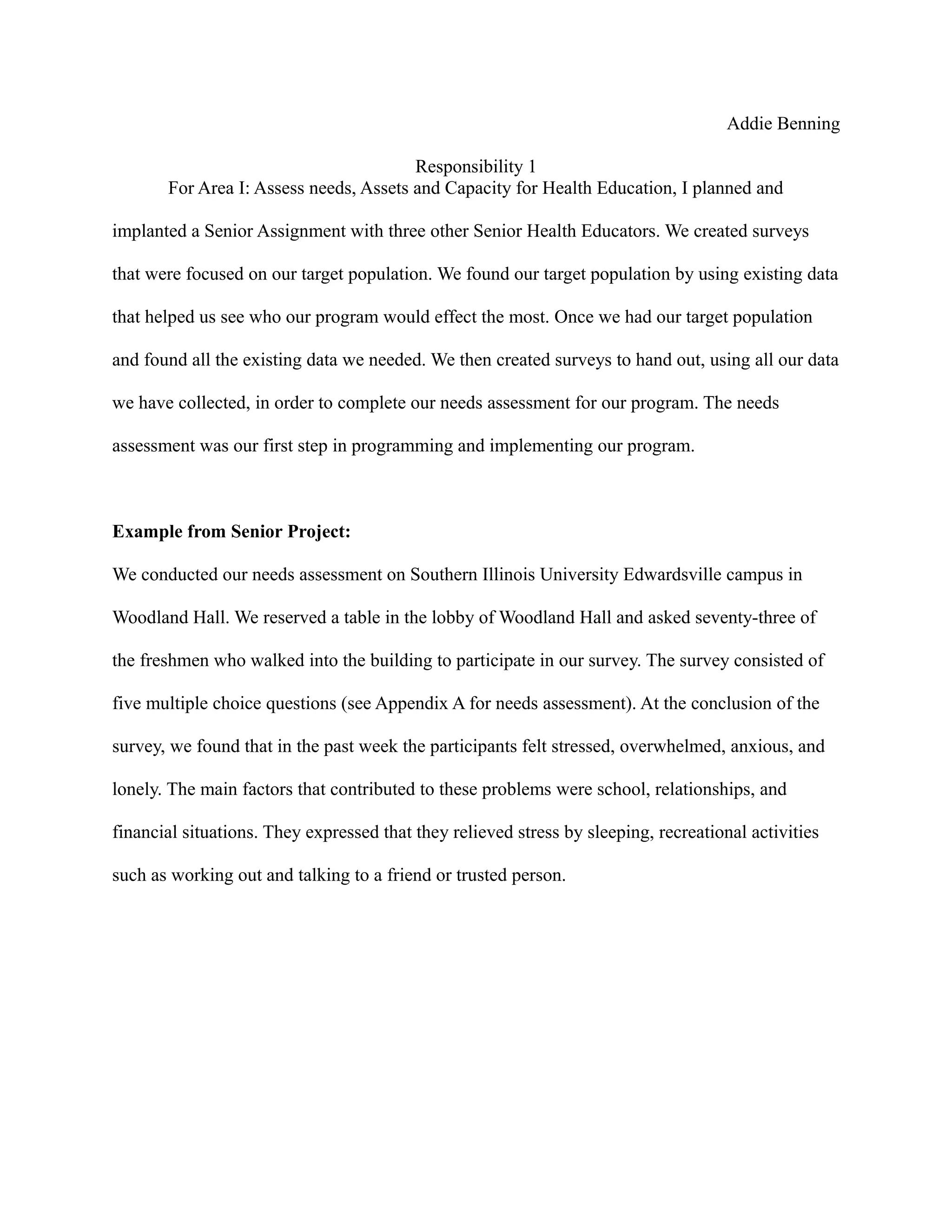 We conducted a needs assessment survey of 73 freshmen living in Woodland Hall at Southern Illinois University Edwardsville to identify their mental health needs. The survey found that in the past week, participants felt stressed, overwhelmed, anxious, and lonely, primarily due to school, relationships, and financial issues. They reported relieving stress through sleeping, working out, and talking with friends or trusted individuals. This needs assessment was the first step in planning and implementing a senior health education project to address the mental health of students in the dorm.