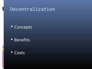 The document discusses decentralization, including its concepts, benefits, and costs, as well as responsibility accounting and its various centers (cost, profit, investment). It covers the evaluation of performance for these centers and details on cost classifications, including controllable and direct costs. Additionally, it addresses transfer pricing methods and accounting treatments for intra-company transfers.