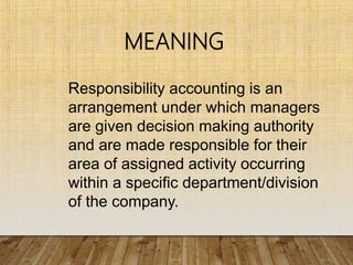 Responsibility accounting is a management accounting method where managers are given decision-making authority over a specific department or division and are held responsible for the activities and results within that area. It requires a clearly defined organizational structure divided into responsibility centers such as cost centers (where managers are responsible for incurred costs), revenue centers (responsible for generating revenue), profit centers (responsible for both costs and revenues), and investment centers (responsible for costs, revenues, and return on capital employed). The goals of responsibility accounting are to improve clarity of goals, assist with planning and budgeting, improve quality and cost control, allow for objective evaluation of managers, and decentralize decision-making.