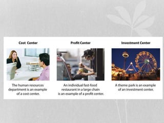 Responsibility accounting is an accounting method that links costs to individuals responsible for their control rather than products or functions. It employs principles such as clearly defined organizational structure, monthly performance reporting, and individual accountability, allowing managers to focus on exceptions and key issues. The implementation process involves identifying responsibility centers, defining responsibilities, and preparing performance reports while distinguishing controllable and non-controllable costs.