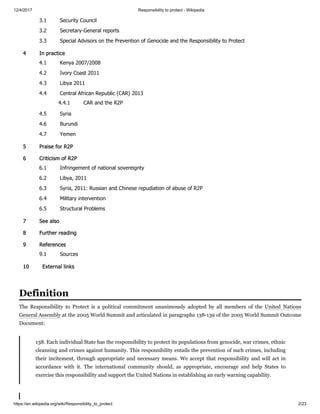 The Responsibility to Protect (R2P) is a global political commitment adopted by UN member states in 2005 to prevent genocide, war crimes, ethnic cleansing, and crimes against humanity, emphasizing that sovereignty entails a responsibility to protect populations from such atrocities. It consists of three pillars: state protection responsibilities, international assistance and capacity-building, and timely and decisive response, with military intervention regarded as a last resort and authorized by the UN Security Council. R2P has generated extensive discussion regarding its implementation and is seen as a framework for both prevention and response to mass atrocity crimes.