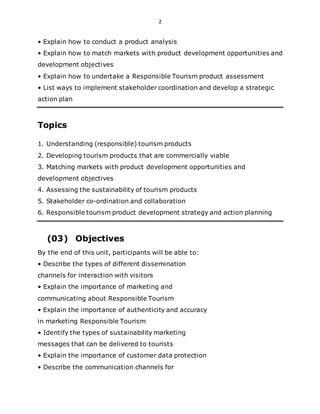 The document outlines a comprehensive curriculum on responsible tourism, detailing objectives for each unit aimed at enhancing understanding of tourism impacts, principles, and practices. Topics include market analysis, stakeholder engagement, sustainable supply chains, responsible marketing, employment practices, and cultural heritage management. The curriculum emphasizes the importance of sustainability in tourism operations, community involvement, and the benefits of responsible tourism for all stakeholders involved.