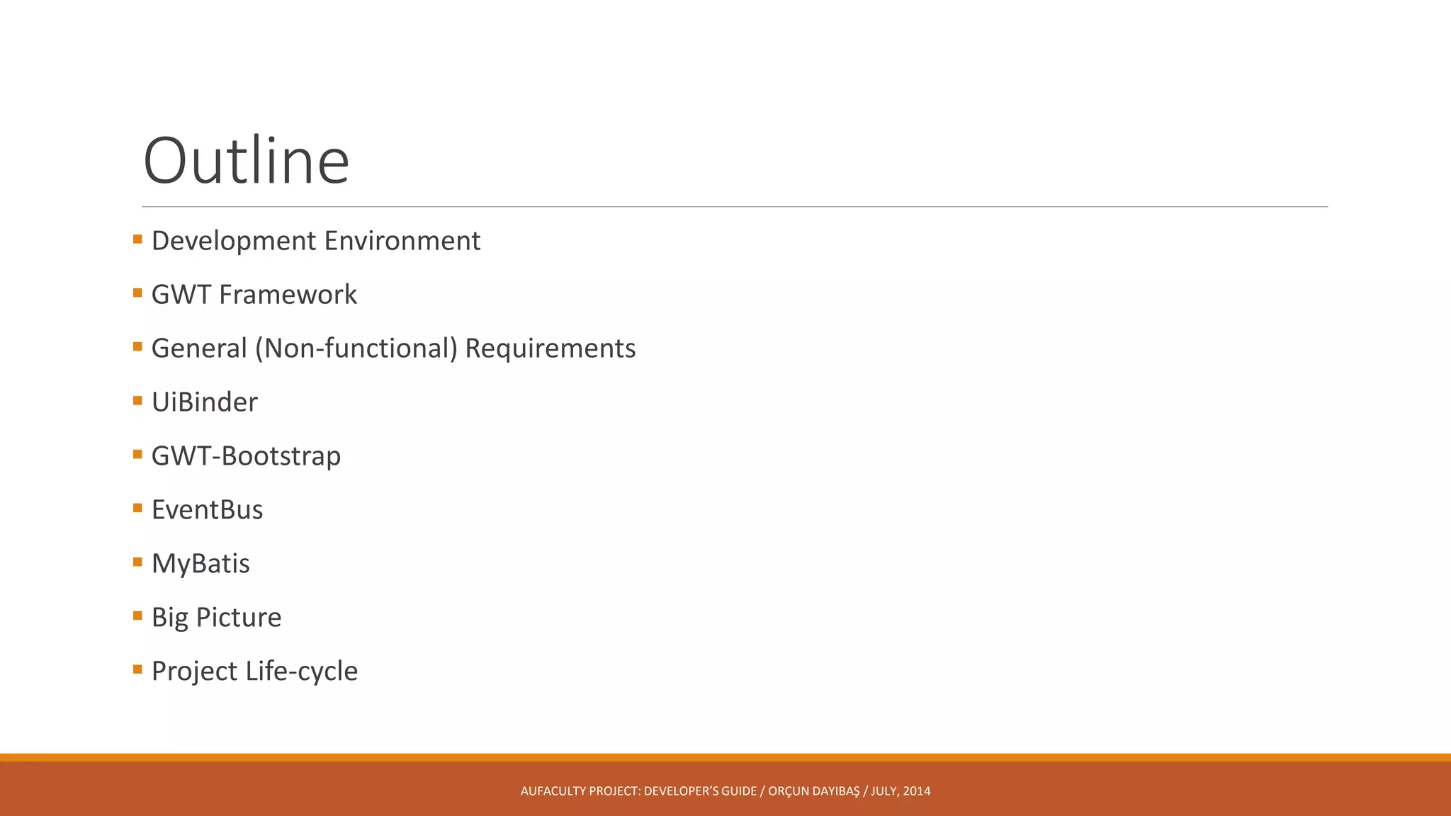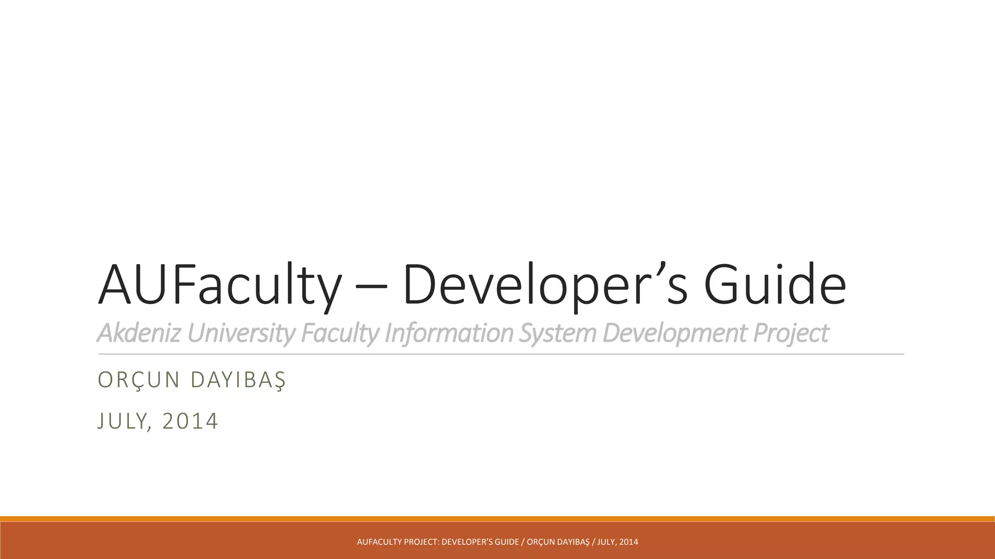 This document provides a developer's guide for the AUFaculty project, which aims to develop an information system for Akdeniz University's faculty. It outlines the development environment and frameworks used, including GWT, UiBinder, GWT-Bootstrap, EventBus and MyBatis. It describes the modular architecture, requirements for responsiveness on mobile and desktop, and emphasis on good user experience. It also covers the project management tools like Trac and Jenkins that are used for version control, continuous integration, and notifications.