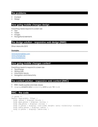 The document discusses a CSS-based approach to responsive content, designed to adapt web content for various devices including desktops, tablets, and phones. It covers the importance of responsive content, its challenges, and provides code examples for implementation. Scott Deloach, the presenter, also shares resources for further learning and application in projects.