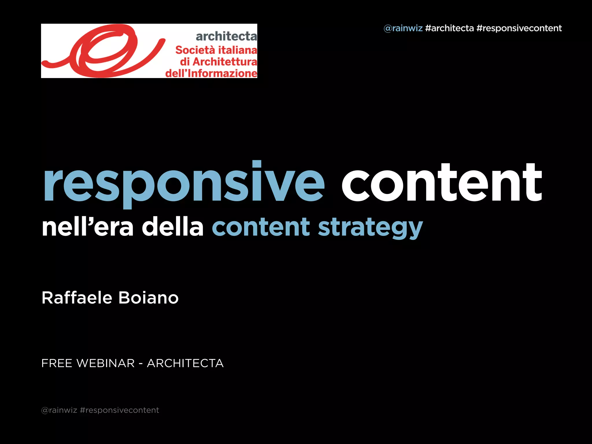 The document discusses responsive content and content strategy in the era of responsive design. It defines key terms like responsive, breakpoints, mobile, content strategy, touchpoints, and content as a service. It emphasizes treating content as a service available across different channels, and having a "create once, publish everywhere" (COPE) system to manage content strategically.