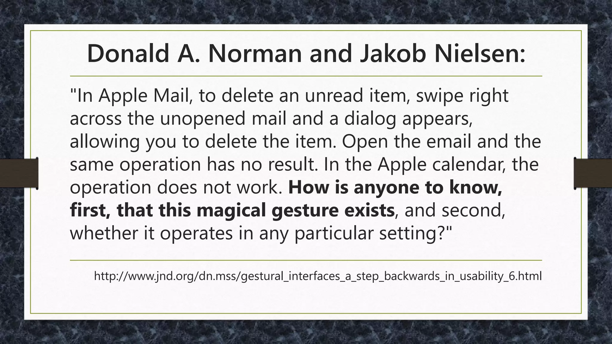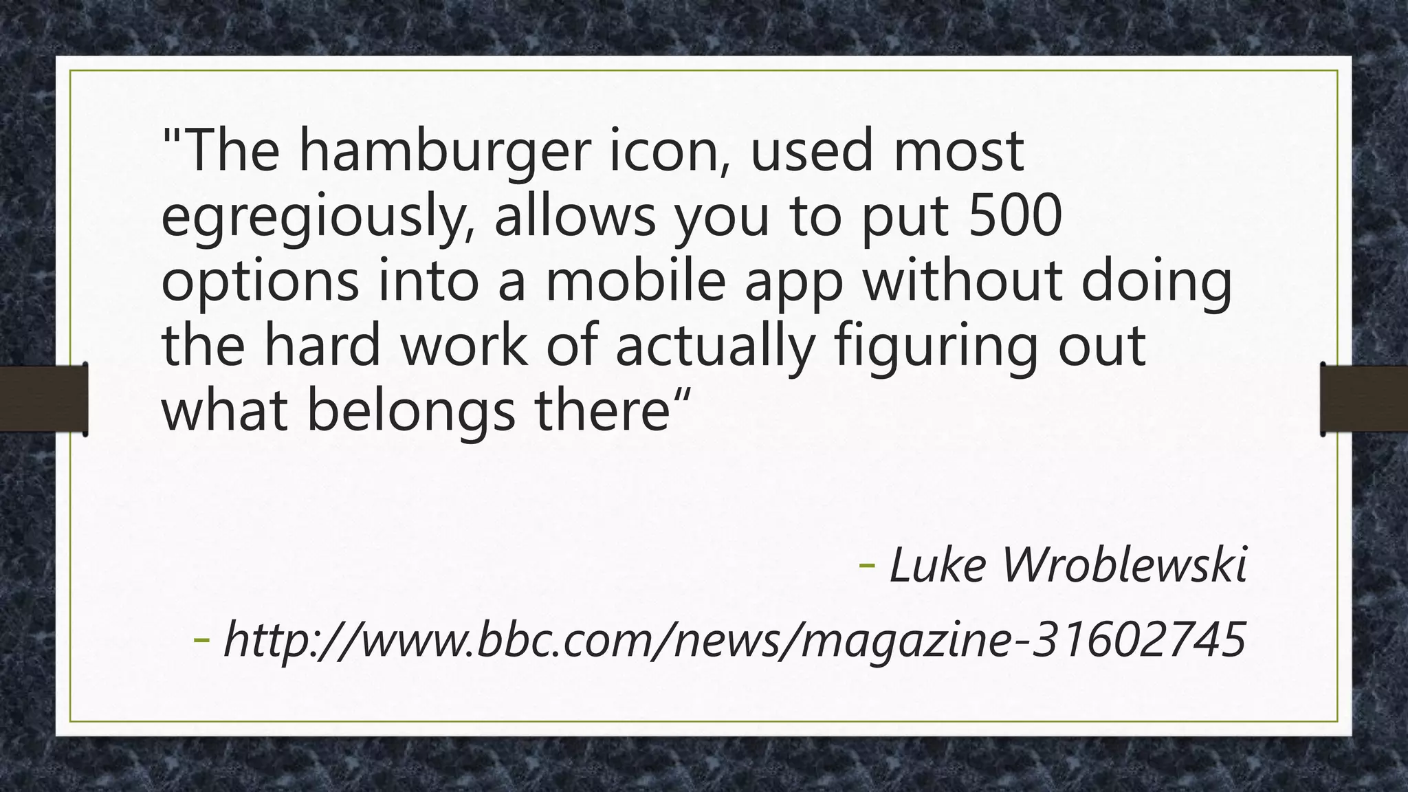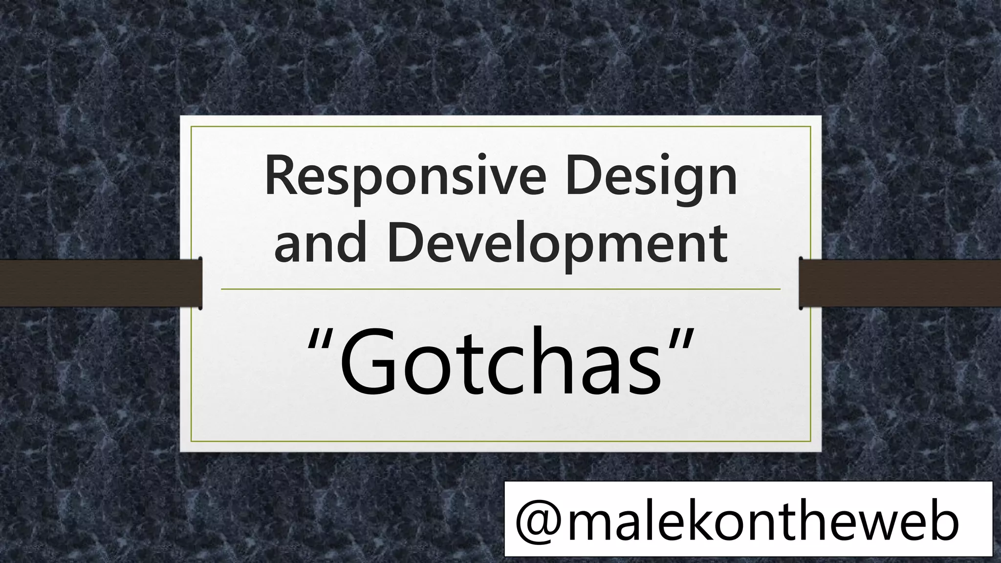 The document discusses key challenges and considerations in responsive design and development, touching on issues like device fragmentation, user needs, and effective onboarding strategies. It emphasizes the importance of simplifying user interfaces, particularly for mobile users, and reducing reliance on complex gestures that may not be accessible to all demographics, including older adults. Additionally, it provides practical recommendations for improving user experience through streamlined forms, navigation, and content strategies.