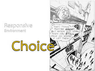 The document discusses the principles of urban design that enhance the responsiveness of public spaces by focusing on key qualities such as permeability, variety, legibility, robustness, visual appropriateness, richness, and personalization. It emphasizes the importance of these qualities in providing choices and experiences for individuals in the built environment. Case studies, particularly from Reading, illustrate how these design elements can create more engaging and user-friendly spaces.