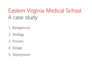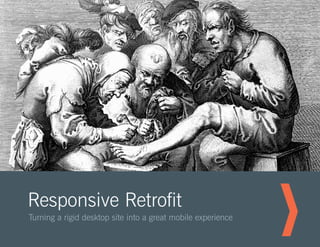 This case study outlines the process of retrofitting the Eastern Virginia Medical School's desktop site to improve its mobile experience, addressing various challenges faced due to the site's extensive content and layout. The strategy included careful planning, user-friendly design, and thorough testing to ensure a seamless transition without disrupting the desktop site. Key recommendations emphasize assessing whether to retrofit or redesign, cataloging complex pages, and adapting the deployment process to enhance usability.