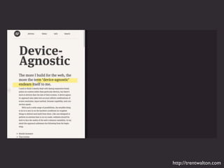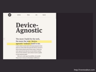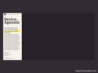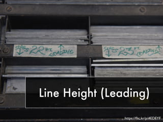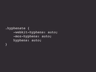 The document discusses responsive typography, emphasizing the use of ems and rems for font sizes, line heights, and margins to enhance readability across different devices. It provides examples of CSS code for various HTML elements and discusses the importance of using fewer and system fonts for performance. Additionally, it includes references to media queries and alignment techniques to ensure text is presented effectively.