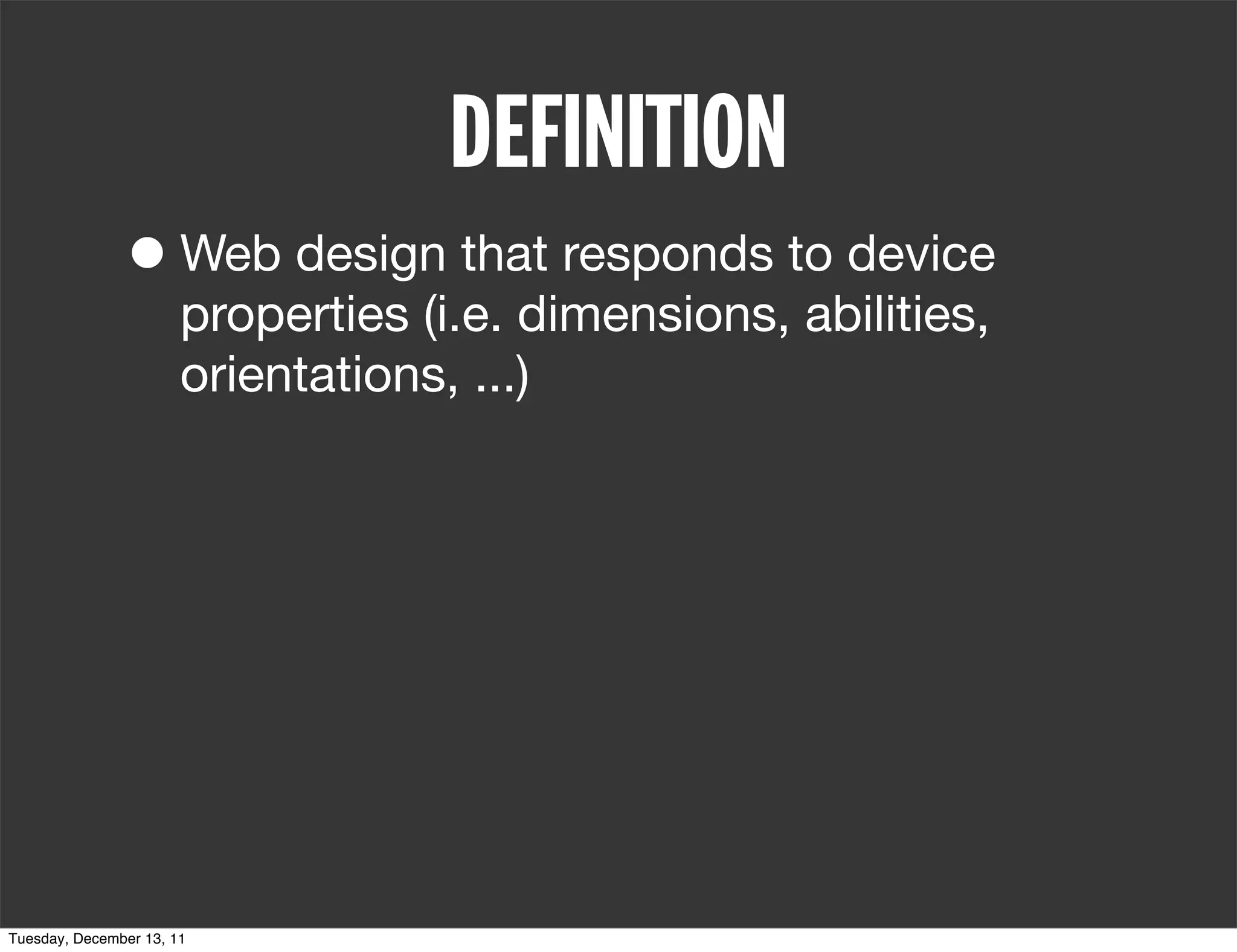 Responsive web design adapts to various device properties, such as dimensions and orientations, using techniques like media queries to apply different styles based on screen size. Key principles include writing semantic HTML and determining whether to adopt a mobile-first or desktop-first approach, along with specific styling for multiple screen widths (320px, 480px, 768px, and 1024px). The document also discusses practical design examples and emphasizes reflowing content effectively to optimize front-end development.