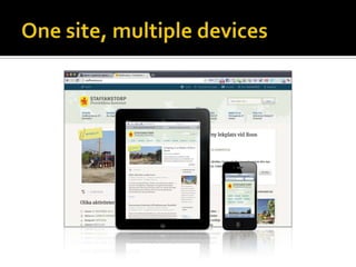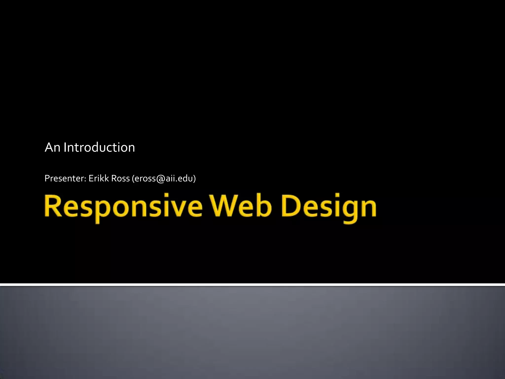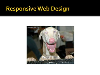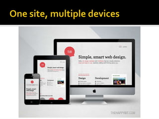 This document introduces the concept of responsive web design. It notes that the number of mobile devices now exceeds desktop computers and the mobile web will surpass the desktop internet by 2015. It then discusses responsive design, which involves creating websites that automatically adjust their layout depending on device and screen size using fluid grids, flexible images and media queries. Examples of responsive sites and resources for learning more are provided.