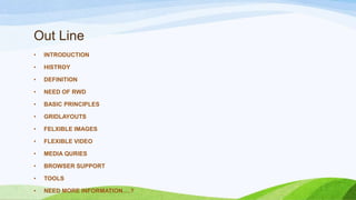 The document discusses responsive web design, including its history beginning in 2010, the basic principles of using flexible grid layouts, images, and videos along with media queries to adapt designs based on screen size. Responsive design allows a single website to be accessed from any device by using fluid, proportional layouts and flexible media to provide the best possible viewing and interaction experience. New techniques like responsive design are necessary to accommodate the growing number of people accessing the web from mobile devices.