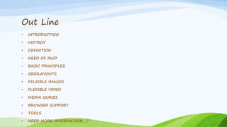 The document discusses responsive web design, including its history beginning in 2010, the basic principles of using flexible grid layouts, images, and videos along with media queries to adapt designs based on screen size. Responsive design allows a single website to be accessed from any device by using fluid, proportional layouts and flexible media. The basic techniques are supported by most modern browsers and tools exist to help designers implement responsive designs.