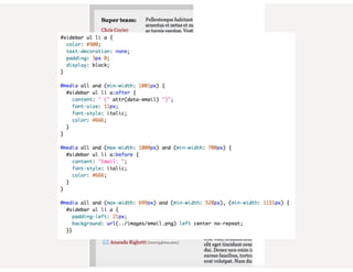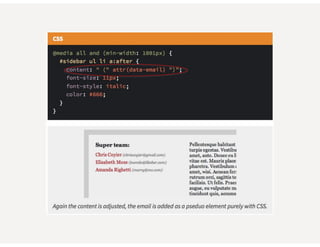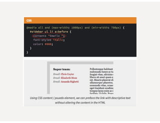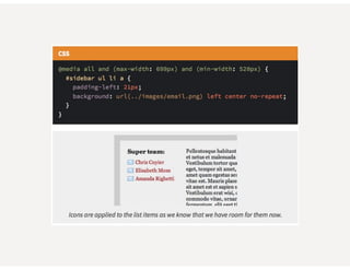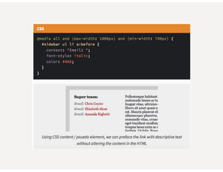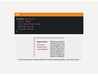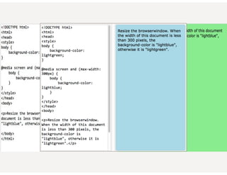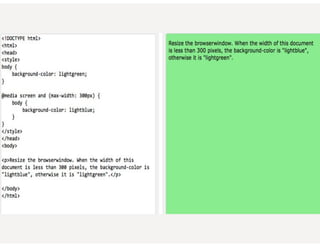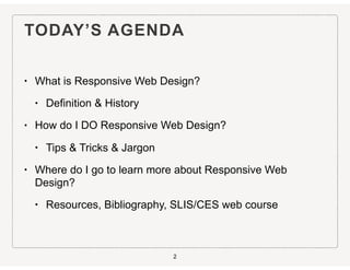 This document provides an overview of responsive web design. It defines responsive web design as an approach that aims to provide optimal viewing experiences across different devices. It discusses the history and alternatives to responsive design. The key aspects of responsive design are then explained, including fluid grids, flexible images, CSS media queries, and using the viewport meta tag. Tools for responsive design like Bootstrap and techniques like fluid layouts are also covered. Finally, resources for further learning about responsive web design are provided.
