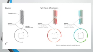 The document discusses the evolution of architecture as media from prescribed to responsive to interactive. Prescribed architecture has a fixed, pre-scripted design like the Beijing National Aquatics Center lighting. Responsive architecture absorbs environmental data and responds, like the Galleria Department Store facade that changes color based on variables. Interactive architecture enables two-way communication between people and buildings in real-time, through installations like Under Scan portraits that interact with pedestrians. The document provides examples of each type and argues interactive architecture can transform spaces into dynamic storytellers that evolve with people's needs.