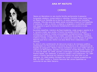 ANA Mª MATUTE(1926) Naceu en Barcelona no seo dunha familia pertencente á pequena burguesía catalana, conservadora e relixiosa. Durante a súa nenez viviu en Madrid e en Mansilla de la Sierra, un pobo pequeno nas montañas rioxanas. Tiña dez anos de idade cando comezou a Guerra Civil Española. A violencia, o odio, a morte, a miseria, a angustia e a extrema pobreza que seguiron á guerra marcaron fondamente a súa persoa e a súa narrativa. Novelista española, membro da Real Academia, onde ocupa o asento K, é a terceira muller que recibe o Premio Cervantes (2010). É tamén profesora invitada en moitas universidades norteamericanas. Matute é considerada por moitos como a mellor novelista da posguerra española. Cultiva a novela, o relato curto e os contos para nenos. Existe un premio literario que leva o seu nome e os seus libros foron traducidos a 23 idiomas. Su obra é unha combinación de denuncia social e de mensaxe poética, ambientada con frecuencia no universo da infancia e da adolescencia da España da posguerra. Moitos críticos consideran que a súa mellor obra é a triloxía Los Mercaderes. Escribe a súa primeira novela Pequeño Teatro aos 17 anos de idade. En 1949, escribe Luciérnagas e queda semifinalista do Premio Nadal, non obstante, a censura impide a súa publicación. En 1984 obtivo o Premio Nacional de Literatura Infantil coa obra Sólo un pie descalzo . En 1996 publica Olvidado Rey Gudú e é elixida académica da RAE. En 2007 recibiu o Premio Nacional das Letras Españolas ao conxunto do seu labor literario.
