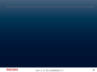 REST 入門 1. REST 入門 株式会社リコー ソフトウェア研究開発本部 山本陽平 2005 年 11 月 24 日 第八回 XML 開発者の日 2. 3. 自己紹介 ソフトウェア技術者、 XML guy 1975 年生まれ ( 同い年の人の例 ) 経験 Web/XML 関係でずーっと (1994 年から ) 画像機器上の Web 技術関係 UPnP, SOAP, etc… Java で Web サービス開発 Axis, etc… REST との出会い 2004 年 8 月、村田さんの blog にて それまでは REST == XML-RPC だと思ってた http://d.hatena.ne.jp/Nayuta/20050727#1122477974 4. 5. はじめに REST は~ではない XML と HTTP の組み合わせではない API の仕様ではない W3C の仕様ではない SOAP の対抗仕様ではない SOA ではない URL のパラメータをいじって XML データを得る方法ではない 今日の目的 REST の誤解を解きたい アーキテクチャスタイルの重要性を共有したい 6. Representational State Transfer REST は WWW のアーキテクチャスタイル Roy Fielding (Apache.org の co-founder) の博士論文 残念ながら日本ではマイナー ( だった ) 海外では 2002 年ごろから盛り上がっている REST の歴史は 1996 年くらいから (HTTP/1.1 の策定とともに ) REST スタイルを知っていると Web アプリ / サービスの スケーラビリティ が上がる、かもしれない Web アプリ / サービスの ユーザビリティ が上がる、かもしれない Web アプリ / サービスが セキュア になる、かもしれない APP みたいなプロトコルを簡単に出せる、かもしれない いわゆる 疎結合 が実現できる、かもしれない 7. 8. アーキテクチャスタイルとは? 英語では “Architectural Style” ソフトウェア工学用語 別名(マクロ)アーキテクチャ パターン アーキテクチャのパターン アーキテクチャそのものではない ことに注意 ミクロアーキテクチャパターン(デザインパターン)の親戚 デザインパターンの方が細かいシステムを対象としている 代表的なアーキテクチャスタイル P2P、MVC、パイプ&フィルタ、クライアントサーバ 各スタイルはそれぞれ特徴的な 制約 の集合から成り立っている MVC: model, view, controller に役割を分担 パイプ&フィルタ: コンポーネント間のデータの流れは一方向 9. 10. 余談: 訳語について Architectural style の訳語は ? (mixi の REST コミュで聞いてみた ) アーキテクチャ的スタイル アーキテクチャのスタイル アーキテクチャの流儀 アーキテクチャ作法 アーキテクチャ様式 設計思想 結局「ソフトウェアエンジニアリング基礎知識体系 – SWEBOK 2004- 」に従った ■ アーキテクチャスタイル ( マクロアーキテクチャパターン ) アーキテクチャスタイルとは、「一組のアーキテクチャあるいはアーキテクチャのグループがそれを満すような、一連の制約」である。したがって、アーキテクチャスタイルは、ソフトウェアシステムのハイレベルな構成 ( マクロアーキテクチャ ) を提供するメタモデルであると見なすこともできる。 11. 12. リソース (1/3) REST における超重要な概念のひとつ リソースの例 東京の天気予報 2005年11月24日のスケジュール 新花巻駅の写真 Dijkstra著 ”Go To Statement Considered Harmful” 僕の最近のブックマーク リソース = 「 名前 」のつくありとあらゆる情報 REST ではリソースをいろいろ操作する 13. リソース (2/3) 識別子 すべてのリソースは識別子 (identifier) を持つ 一つのリソースに複数の識別子がつくこともある Web では URI 東京の天気予報 http://weather.yahoo.co.jp/weather/jp/13/4410.html 2005 年 11 月 24 日のスケジュール https://example.com/schedule/20051124 新花巻駅の写真 http://www.flickr.com/photos/60043209@N00/6337155/ Dijkstra 著 ” Go To Statement Considered Harmful” http://www.acm.org/classics/oct95/ 僕の最近のブックマーク http://del.icio.us/yohei 14. リソース (3/3) 状態 リソースは状態 (state) を持つ 時間や条件とともに内容が変化する可能性がある 「 リソースの意味 」は時間や条件によらず不変である REST はリソースの representational state を transfer する 東京の明日の天気予報 (Resource) Receiver 時間による変化 晴れ 雨 1 月 5 日 AM ( 明日は晴れそう ) 1 月 5 日 PM ( 明日は雨っぽい ) 左から右に転送 ある時点におけるリソースの状態の具象的な表現 15. 余談: リソース == オブジェクト? オブジェクトとリソースは、ちょっと違う 利用 Consumer Object Interface 転送 Consumer Resource Uniform Interface http://www.markbaker.ca/2002/09/Blog/2004/10/29#2004-10-protocols REST のリソースモデリングをするときに OO の考え方が邪魔になることがある、かもしれない 16. 質問 リソースの URI を与えられたら何をしますか ? 東京の天気予報 http://weather.yahoo.co.jp/weather/jp/13/4410.html 2005 年 11 月 24 日のスケジュール https://example.com/schedule/20051124 新花巻駅の写真 http://www.flickr.com/photos/60043209@N00/6337155/ Dijkstra 著 ” Go To Statement Considered Harmful” http://www.acm.org/classics/oct95/ 僕の最近のブックマーク http://del.icio.us/yohei これ 17. URI の貼り付け == リソースの表現の取得 URI があったらブラウザのアドレス欄に入れてみる これを REST 的に見ると URI (= リソースの識別子 ) を使って リソースのその時点での 状態の表現 を HTTP GET で取得 している ネットサーフィン(死語)も本質的には同じ リンク