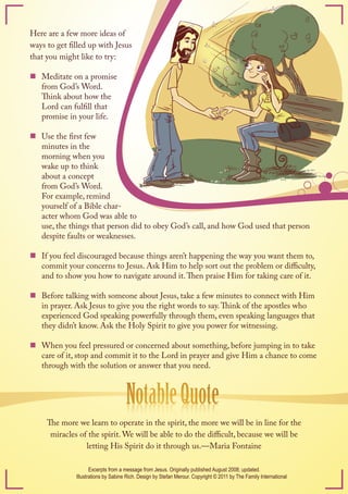 The document emphasizes the importance of spending time with God to channel His spirit effectively to others, likening this relationship to a pipe delivering water from a reservoir. It suggests various practices such as prayer, meditation on scripture, and reflecting on God's promises to enhance this connection. By doing so, individuals can become reflections of God's love and carry His message more powerfully in their interactions.