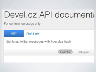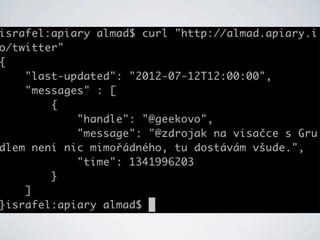 This document discusses REST API tools and describes Apiary.io, which provides documentation and testing for REST APIs. It outlines Apiary.io's key features like being easy to clone and share on GitHub, including debugging and support, and being supported by regression tests. It also gives an overview of the technologies used, including JavaScript, Express, MongoDB, and testing tools like Mocha and Chai.