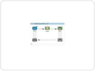 This document provides an example of using a REST component in Mule to create a RESTful API for arithmetic operations. It defines a Java class with POST methods for addition, subtraction, and multiplication that accept JSON payloads and return JSON responses. The REST component is configured in a flow with an HTTP inbound endpoint to expose the operations at URLs. Details are provided on testing the API by triggering the methods and viewing the responses.