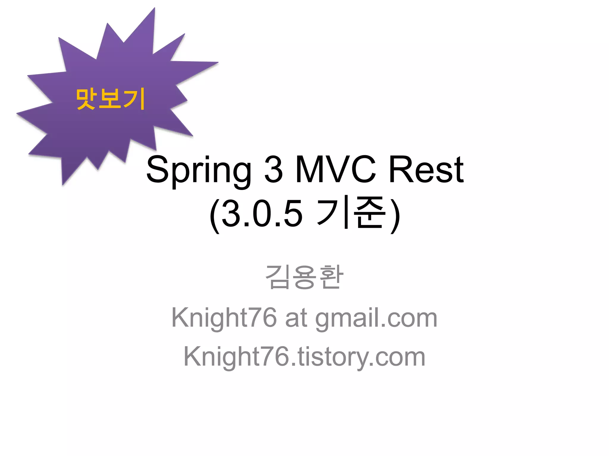 Spring 3 MVC can be used to build RESTful web services. It supports annotations like @Controller, @RequestMapping and @PathVariable to map HTTP requests to controller methods. Requests and responses can be in various formats like JSON, XML, RSS using ContentNegotiatingViewResolver. Custom converters can be used to convert request parameters to Java objects. Exceptions can be handled using @ExceptionHandler.