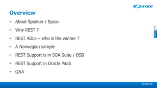 This document provides an overview of REST APIs and discusses why REST is commonly preferred over SOAP. It describes various REST API description languages (ADLs) like Swagger, RAML, and WADL and compares their support in Oracle products. It also provides examples of describing a sample Norwegian dataset API in RAML and implementing REST support in SOA Suite, including creating WADLs from other ADLs or using the REST adapter. The document concludes with discussing REST support in Java EE and Oracle PaaS products.