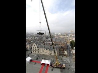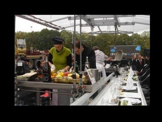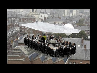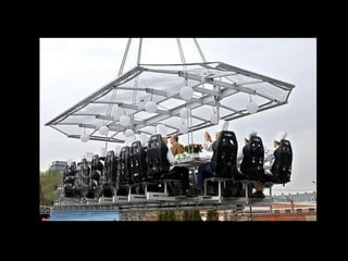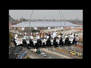 Benji Fun Company in Belgium offers a unique dining experience 50 meters above ground, arranged by a professional event planner. The experience accommodates up to 22 people with a chef, server, and musician, and allows customers to select their own location without limitations. Safety is guaranteed by a hoisting crane that can lift the dining area, band, or cars for presentations.