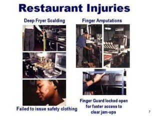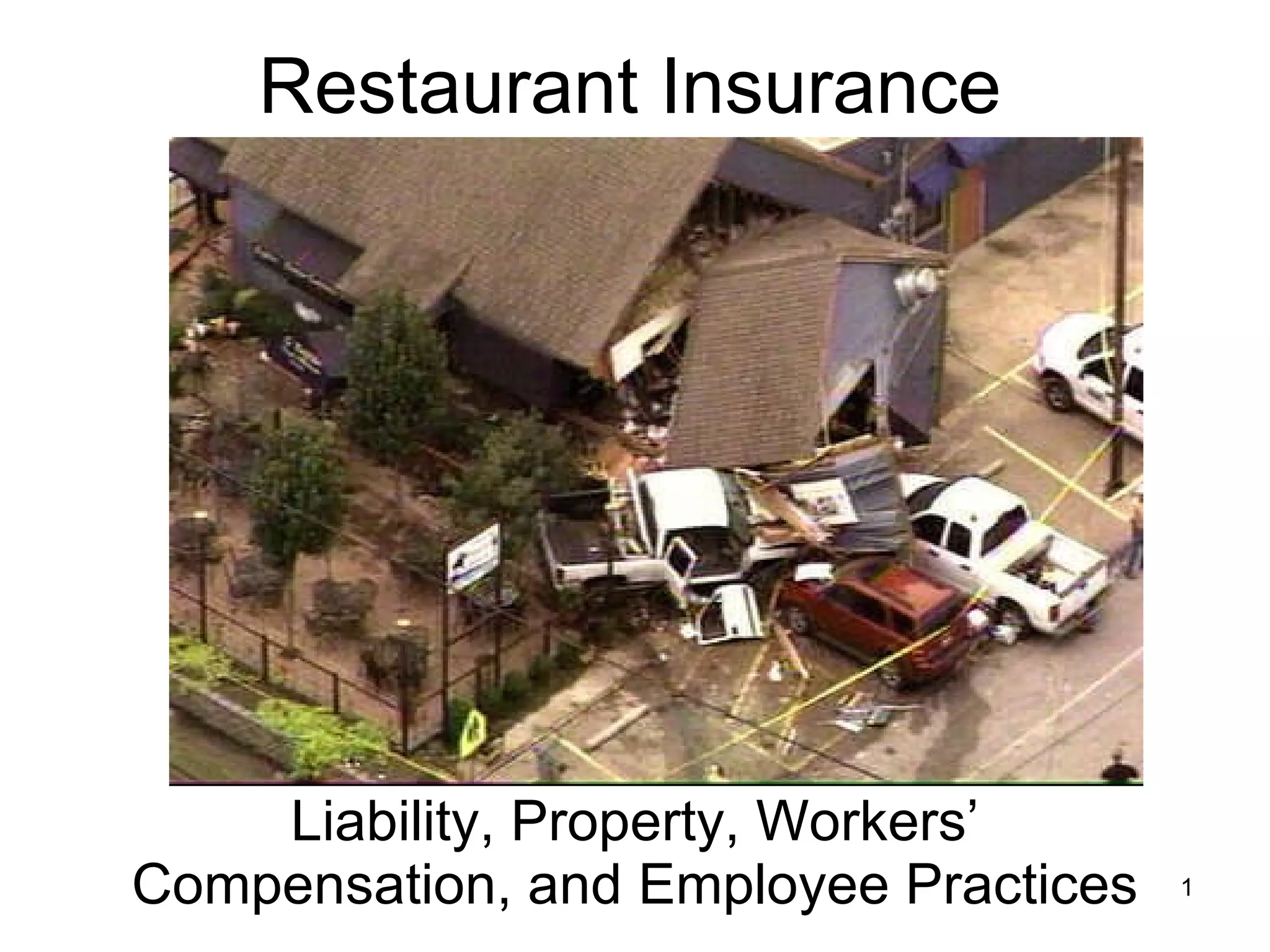 The document discusses various types of insurance relevant to restaurants, including liability, workers' compensation, and employee practices liability. It highlights important coverage aspects such as employee dishonesty, business income loss, and specific policy exclusions like flood and earthquake damage. Additionally, it addresses claims management and legal protections for issues like sexual harassment and discrimination among employees and patrons.