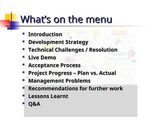 The final project presentation details the development and implementation of a restaurant management system for the Straits Chinese Restaurant group in Singapore. Key topics covered include the project's development strategy, technical challenges faced, acceptance processes, and lessons learned, alongside a live demo of the system's functionalities. The presentation also outlines project milestones, management challenges, and recommendations for future work to enhance the system.