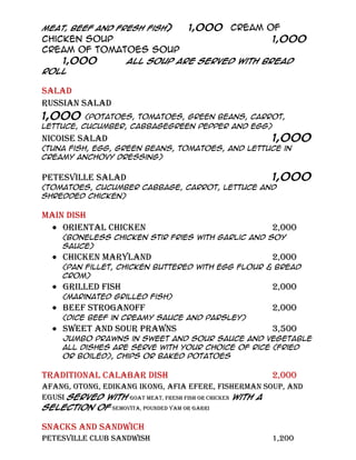 This document is a menu for a hotel restaurant. It lists breakfast, soup, salad, main dish, snacks/sandwiches, pasta, and dessert options along with their prices. Breakfast options include a continental breakfast for 1,500, American breakfast for 2,200, and traditional African breakfasts ranging from 1,000-1,500. Soups listed are pepper soup, cream of chicken soup, and cream of tomato soup, all for 1,000. Salad options between 1,000-1,000 include Russian salad, Nicoise salad, and Petesville salad. Main dishes from 2,000-3,500 include options like chicken, fish, beef, and prawns. Traditional Calabar dishes