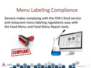 Genesis provides tools for complying with FDA menu labeling regulations, guiding users through a step-by-step process to create and analyze food menus. The software allows users to enter recipes, categorize them, add prices, and review nutrient displays. It includes various features for recipe formulation, product development, and compliance with labeling requirements.