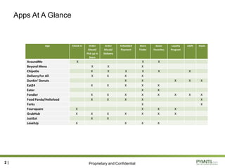 This document provides an overview of 27 mobile apps for online ordering and delivery from restaurants. It summarizes key features and stats for each app, including available locations, partnerships, user statistics, and recent updates. Major apps covered include Starbucks, GrubHub, Uber Eats, DoorDash, Postmates and others. The document serves as a reference for the latest innovations in the online food ordering space.