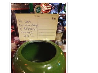 Ken collects tip bowl signs that he displays in his home. He has amassed a large collection of signs over the years from restaurants that have closed or remodeled. Ken enjoys sharing photos of his collection online and hearing stories from others about the restaurants and signs.
