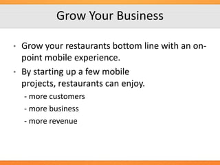 This document discusses why restaurants need a mobile experience and presence. It notes that 91% of adults have smartphones and over 500 million Android phones and 300 million iPhones have been activated. Having a mobile-optimized website and app allows restaurants to reach more customers, provide more options like online ordering and reservations, increase loyalty through rewards programs, and see increased revenue and business. Developing a mobile strategy is important as consumers increasingly search for local businesses and make purchasing decisions using their phones.