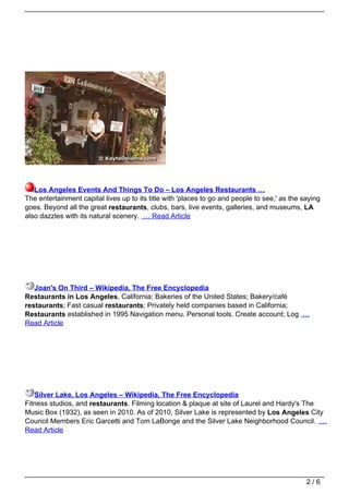 The document discusses several restaurants located in and around Los Angeles, California. It mentions restaurants in La Honda, Woodside, Saugus, West Hollywood on La Cienega Boulevard, Silver Lake, Mid-City, and La Jolla. It also discusses Joan's on Third bakery/restaurant and provides information on participating restaurants in the San Diego area. The document provides addresses, phone numbers, details on cuisine and atmosphere for many of these California restaurants.