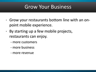 This document discusses why mobile experiences are important for restaurants to reach customers. It notes that customers are increasingly using mobile devices to find businesses and that not having a mobile presence can lose a restaurant customers. It then outlines different mobile options for restaurants like mobile apps, websites and QR codes. It provides details on the benefits of apps, such as increasing orders, visits and revenue. It also lists many features that can be included in a restaurant app like menus, reservations, feedback and loyalty programs. Finally, it discusses pricing and services for developing a custom restaurant mobile app.