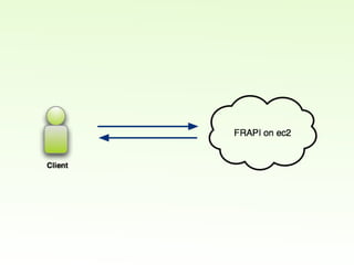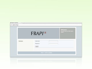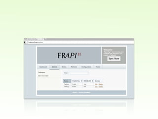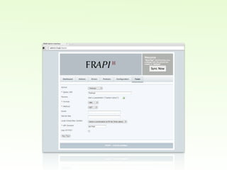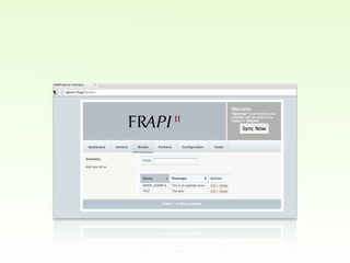This document discusses FRAPI, a framework for building RESTful APIs. It provides both a management panel and developer-facing API for creating RESTful services. FRAPI aims to solve issues like laziness, performance problems, and long development times. It emphasizes building APIs with performance as a primary goal and without unnecessary complexity or "magic". The document outlines some of FRAPI's key features such as management, authentication, database support, content negotiation, code generation, and documentation. It also provides examples of projects using FRAPI and discusses development considerations.