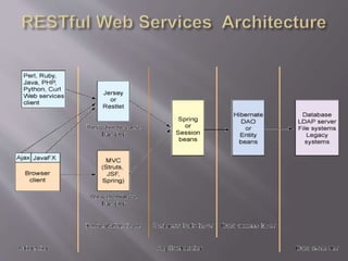 The document provides an overview of a seminar on RESTful web services. It discusses what REST is, its characteristics and principles, and compares RESTful architectures to SOAP. Key points covered include how REST focuses on a system's resources and how they are addressed and transferred over HTTP, the client-server interaction style of REST, and advantages of REST like scalability and loose coupling between components.