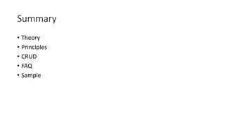 The document outlines the principles and practices of RESTful web services, emphasizing that REST is an architectural style rather than a protocol. Key constraints include client-server separation, stateless communication, and the use of a uniform interface for managing resources identified by URIs through standard HTTP methods. It also provides examples and code snippets demonstrating CRUD operations using RESTful APIs in Java and Angular, as well as JSON-Patch for managing changes to JSON documents.